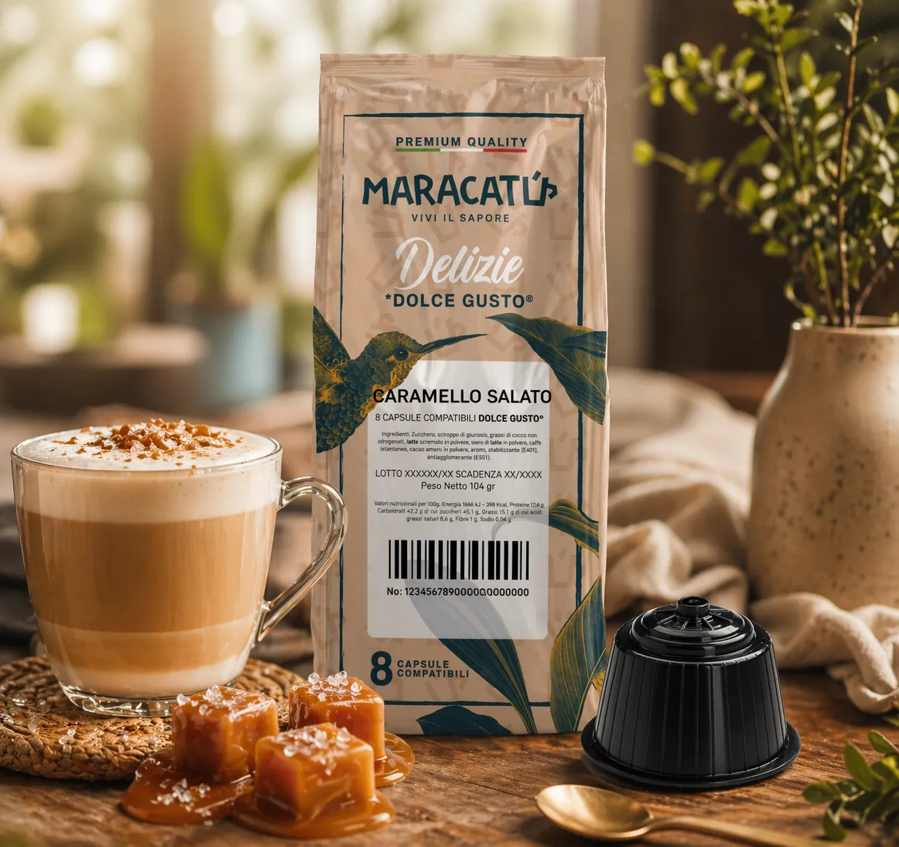 Entdecken Sie den unwiderstehlichen Geschmack von Maracatú Gesalzenes Karamell, einem glatten und verwöhnenden Getränk in 8 Dolce Gusto kompatiblen Kapseln. Die reichen Karamellnoten sind perfekt durch einen subtilen Salzakzent ausbalanciert und schaffen einen raffinierten Kontrast, der die Sinne erfreut.