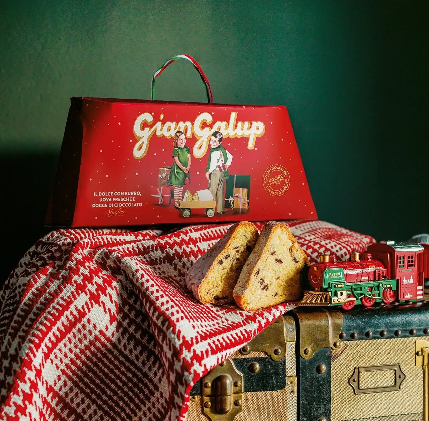 Giangalup mit Streglio-Schokoladenstückchen: ein einzigartiger Panettone, der eine Hommage an den berühmten Turiner Gianduiotto darstellt, mit einem weichen Teig, angereichert mit Streglio-Schokoladenstückchen und einer Prise Puderzucker.