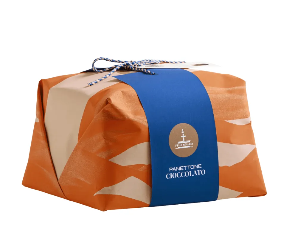 Panettone with chocolate chips covered in icing, hand-wrapped.
