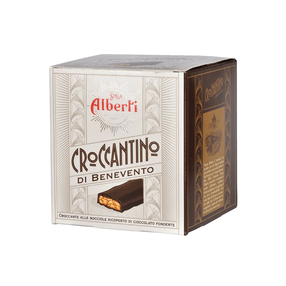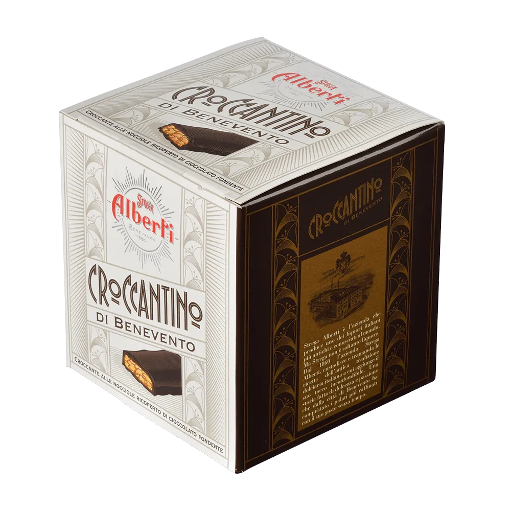 Croccantino Cubotto Strega Alberti 200g to klasyczna włoska słodycz z Benevento 🇮🇹. Chrupiący karmel z 23% orzechów laskowych, pokryty gorzką czekoladą o zawartości kakao minimum 51%, tworzy wyjątkowo harmonijny smak 🍫🌰.