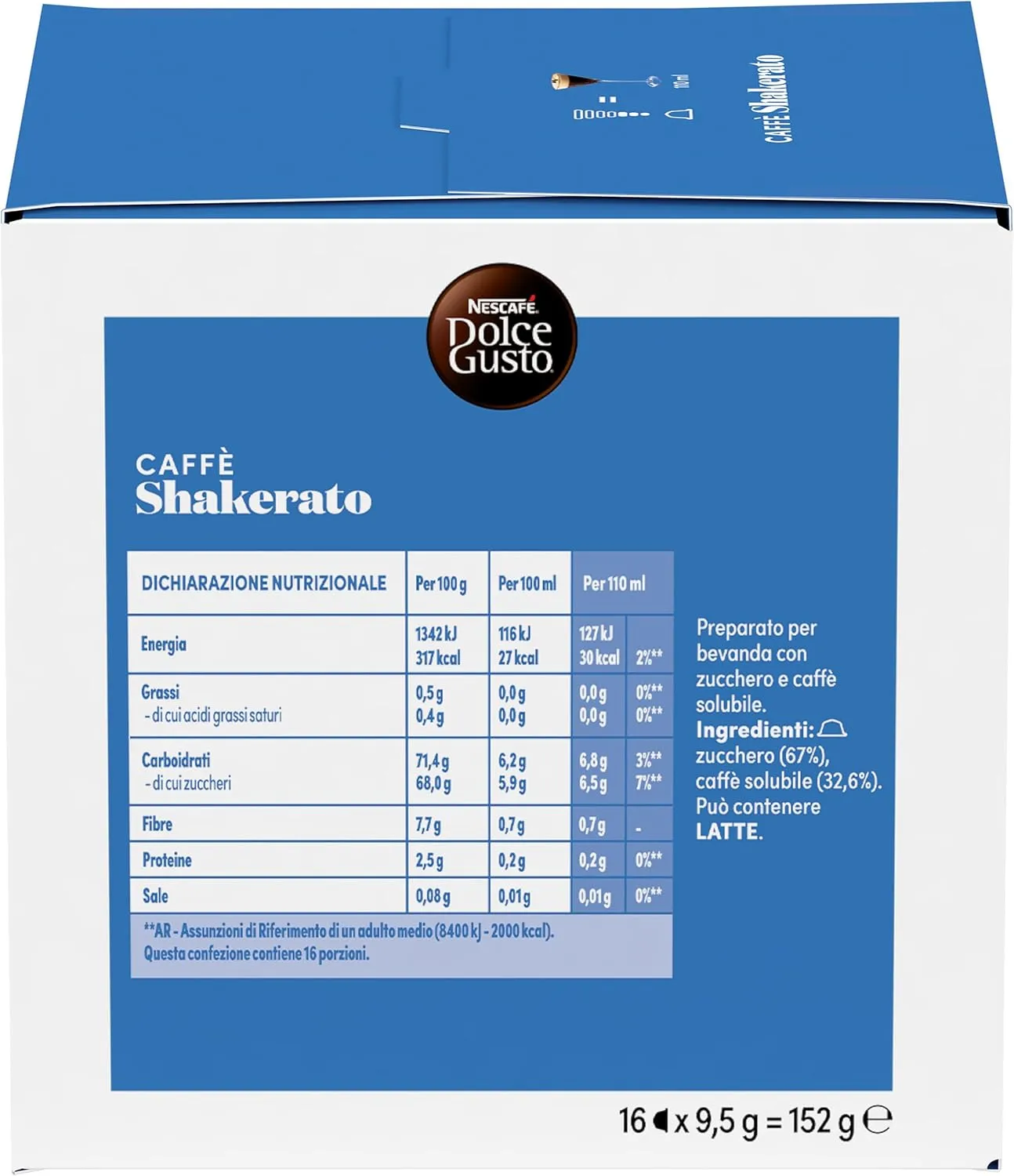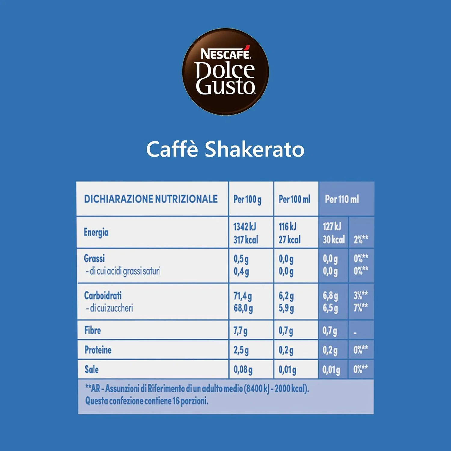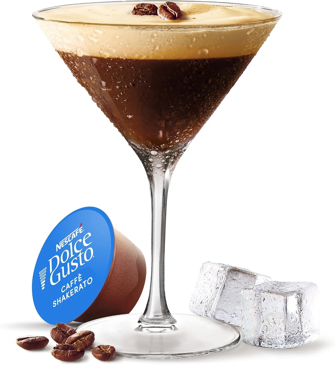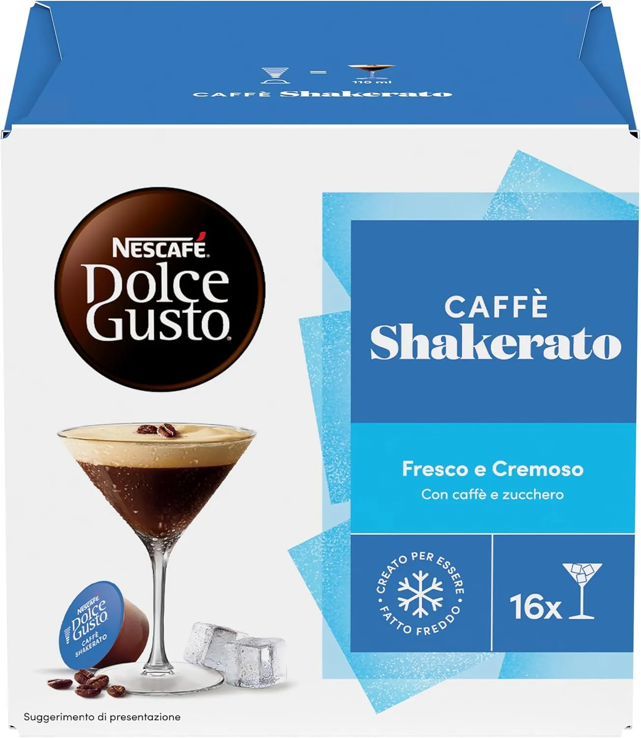 16 Capsule Originali Nescafè Dolce Gusto CAFFÈ SHAKERATO – il gusto intenso del caffè in versione fredda e cremosa ❄️☕. Una bevanda rinfrescante e moderna, con tutta l’energia del caffè e una texture morbida e vellutata, perfetta per le giornate calde o per una pausa diversa dal solito.