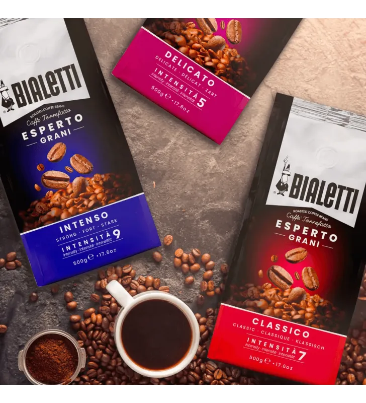 Caffè in grani Bialetti Intenso 500g sono tostati secondo l'originale tradizione italiana ☕. Miscela forte e corposa con tostatura scura e intensità 9/10. Perfetto per un inizio di giornata energico! Ideale per chi ama caffè forte e ricco. Premium caffè in grani 🌿.