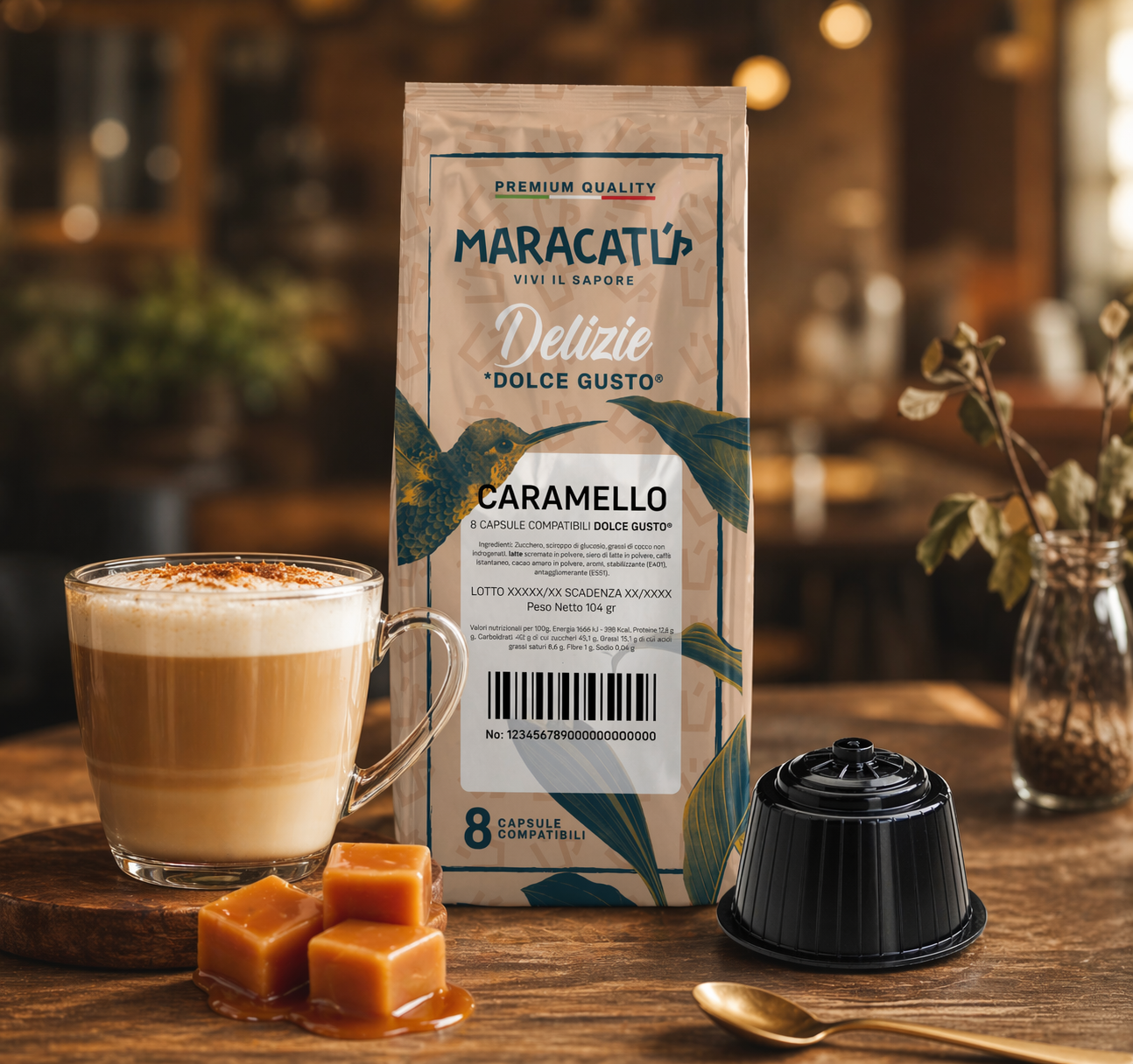 Esplora una dolce delizia con le nostre 8 Capsule Caramello Maracatú compatibili con Nescafé Dolce Gusto. Goditi un momento di puro piacere con questa combinazione irresistibile di espresso e caramello cremoso, creata appositamente per soddisfare il tuo palato con una dolcezza avvolgente.