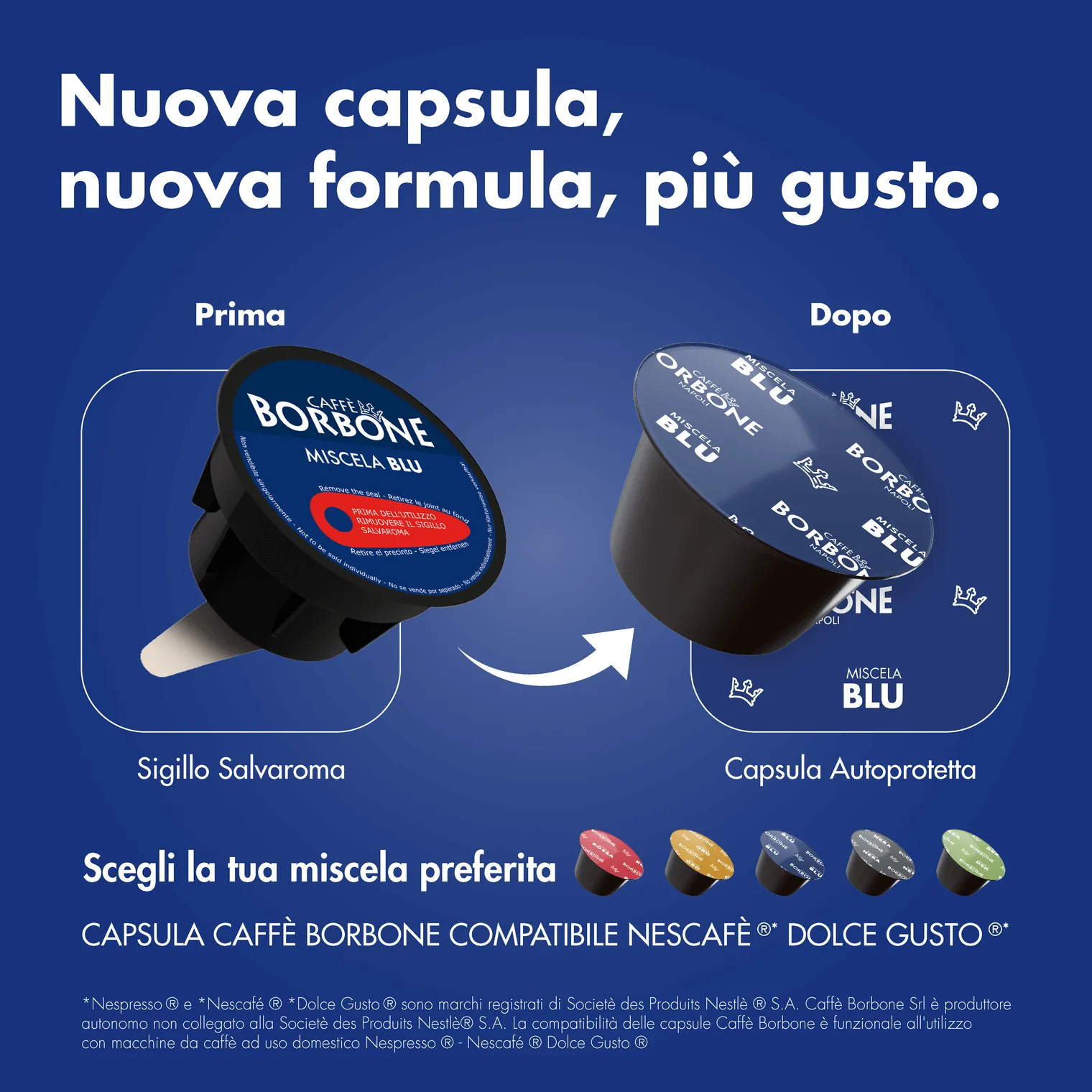 90 Capsule Caffè Borbone Dolce Gusto Miscela BLU "Dolce Re" compatibili con macchine Nescafé Dolce Gusto ☕. Caffè equilibrato e corposo, cremoso e perfettamente dosato per ottenere un caffè unico degno del tuo bar di fiducia 📦.