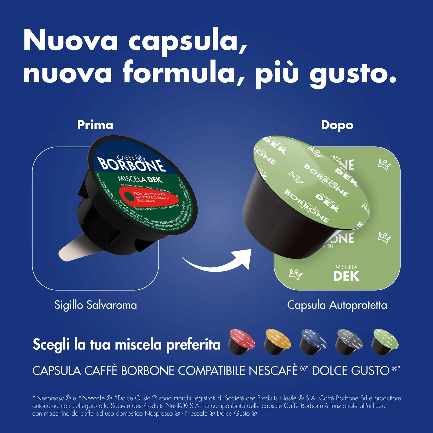 90 Capsule Caffè Borbone Dolce Gusto DECAFFEINATO "Dolce Re" compatibili con macchine Nescafé Dolce Gusto ☕. Delicato al palato mantenendo i tratti eccellenti di un espresso, la miscela verde rappresenta una piacevole sorpresa per chi non apprezza la caffeina 📦.