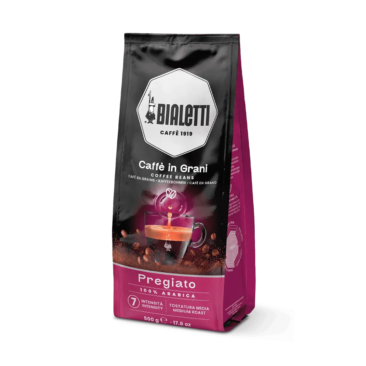 Il Caffè in Grani Pregiato di Bialetti offre un gusto leggero, realizzato con chicchi 100% arabica, tostati secondo l'originale tradizione italiana. Con un livello di tostatura medio e un'intensità di 6/10, questo caffè morbido e aromatico è perfetto per essere gustato in qualsiasi momento della giornata.