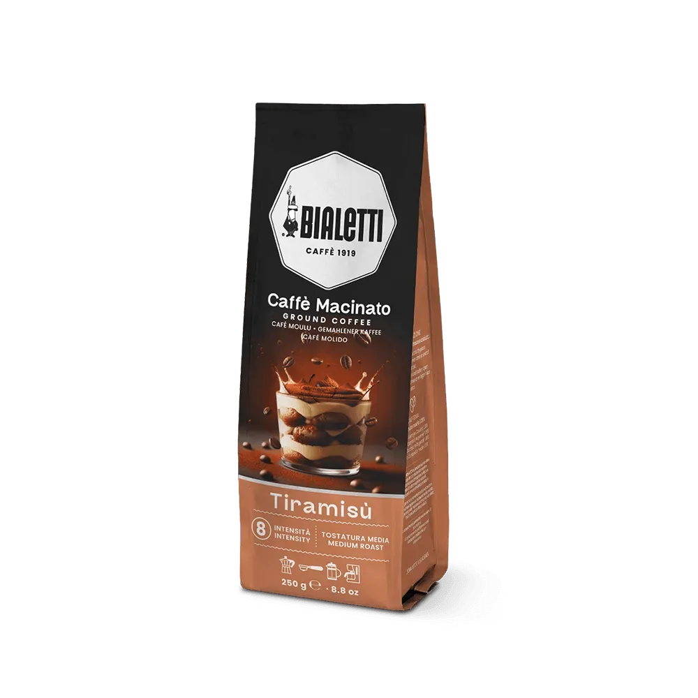 Caffè macinato Bialetti Gusto Tiramisù 250 g ☕ – miscela aromatizzata con note dolci di cioccolato, mascarpone e biscotto. Tostatura medio-scura, intensità 8/10. Perfetto per moka, espresso e French press.