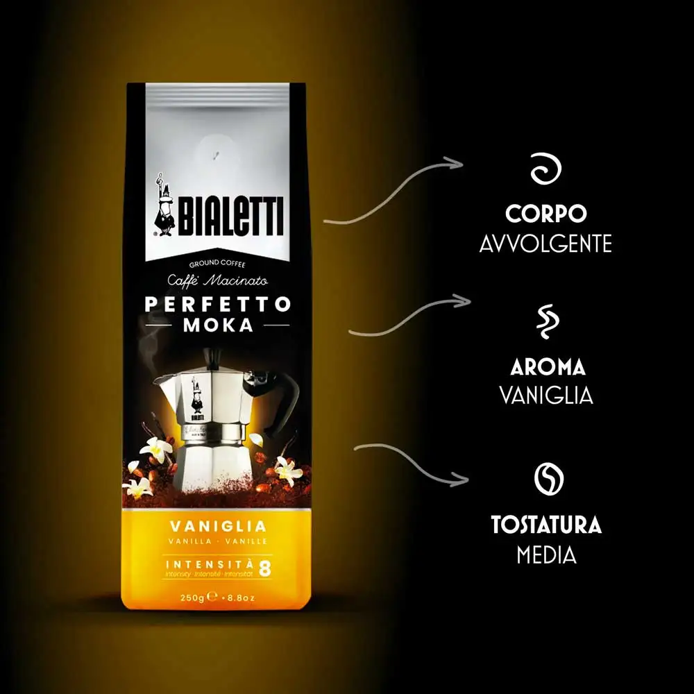 Caffè macinato Bialetti Perfetto Moka Vaniglia 250 g ☕ – miscela 80% Arabica e 20% Robusta, dolce e aromatica con note di vaniglia naturale. Tostatura media, intensità 8/10.