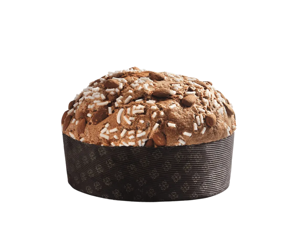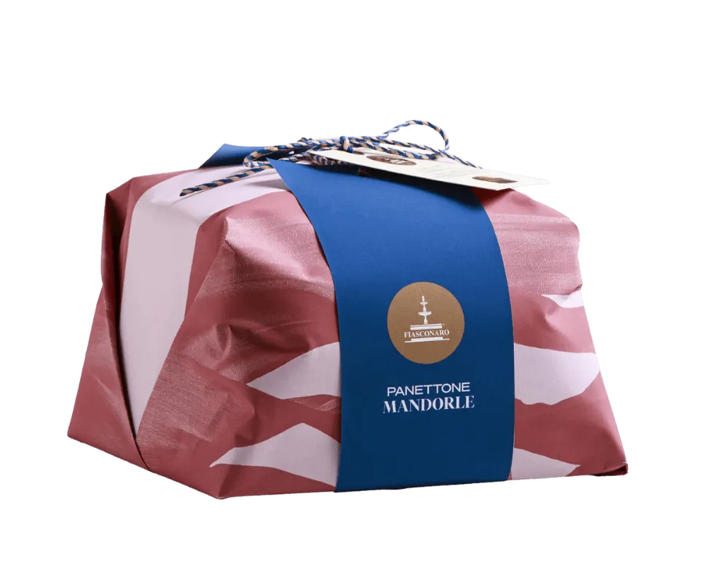 Panettone con uvetta ricoperto di glassa e mandorle, incartato a mano.