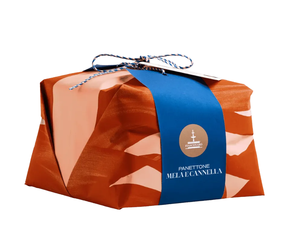 Panettone artigianale siciliano con mela candita e cannella, soffice e profumato. Lievitazione naturale e ingredienti di alta qualità firmati Fiasconaro.